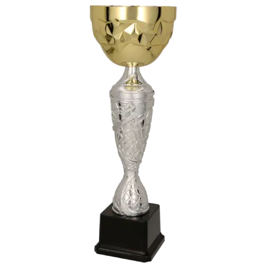Cette coupe séduit par son calice en métal doré orné de motifs géométriques en relief. Le pied en plastique argenté, richement décoré, allie élégance et solidité. L’or symbolise l’excellence suprême, tandis que l’argent rend hommage aux vice-champions. La base haute en plastique assure stabilité et solidité. C’est l’un des modèles classiques avec une touche contemporaine.