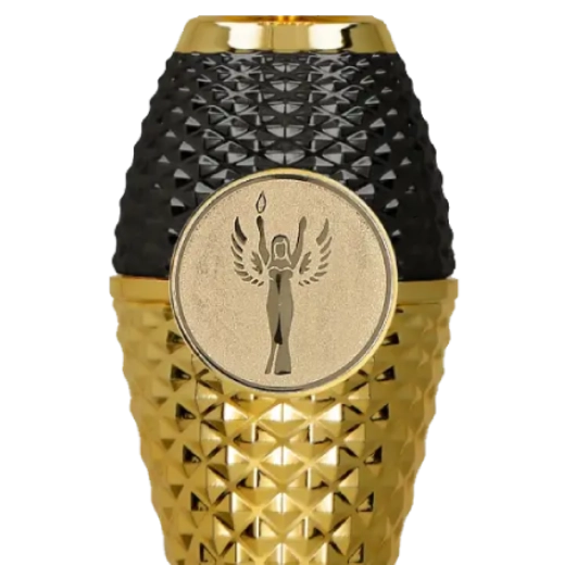 La Coupe 8346 séduit par la qualité de sa réalisation. Son gobelet métallique plein doré reflète magnifiquement la lumière, offrant une présence remarquable lors de chaque cérémonie. La tige élégante en matière synthétique, dans les tons noir et or, est décorée d’un motif géométrique original qui apporte une touche de sophistication. Un emplacement dédié à un emblème permet de personnaliser davantage la coupe avec le symbole de la discipline ou de l’événement. L’ensemble est posé sur une base en marbre robuste, assurant stabilité et prestige.