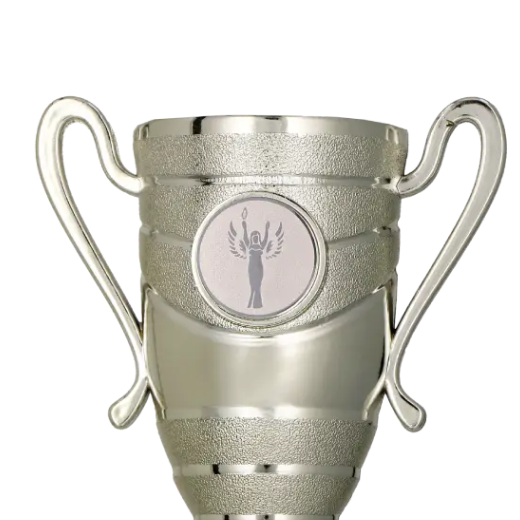 La coupe est fabriquée en plastique de haute qualité de couleur argentée, imitant parfaitement le métal. Sa taille compacte combinée à une forme soignée lui confère un aspect chic et professionnel. Ses anses latérales rappellent les trophées sportifs classiques et prestigieux. Au centre se trouve un emplacement pour un emblème, que l’on peut adapter au type d’événement – sport, culture ou événements professionnels.