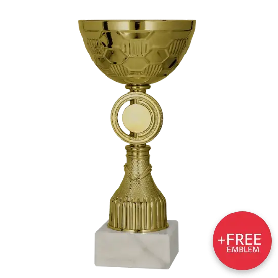 La Coupe Dorée 9291 séduit par sa construction raffinée. Son grand calice métallique doré est orné de décorations géométriques rappelant des alvéoles, apportant un caractère contemporain à la coupe. La base richement décorée souligne l’élégance de la récompense, créant un ensemble harmonieux et impressionnant. La coupe repose sur une solide base en marbre clair, qui assure la stabilité et constitue un support idéal pour la personnalisation.