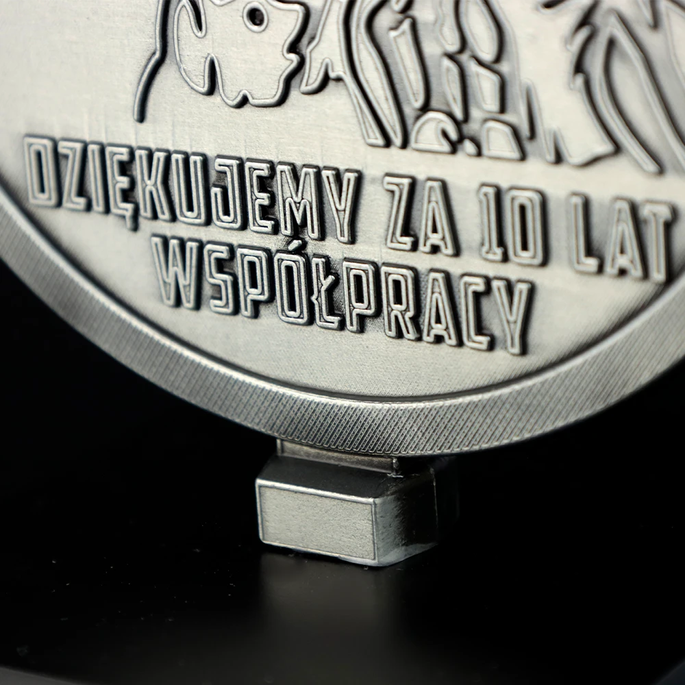 Nous proposons de nombreuses options de personnalisation, adaptées exactement à vos besoins. Toutes nos trophées sont fabriqués sur commande, selon les spécifications précises de nos clients. Un exemple concret est cette récompense personnalisée, conçue pour célébrer 10 années de collaboration avec le club sportif Adler Berlin.