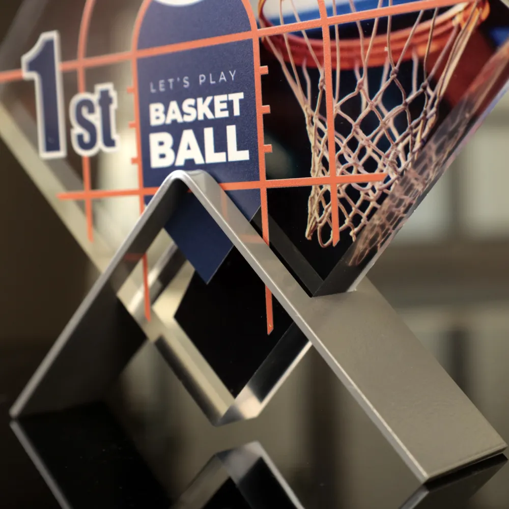 Le trophée présenté combine une forme minimaliste avec une impression dynamique et colorée, qui attire le regard et souligne parfaitement le caractère sportif de l’objet. La qualité élevée de la graphique détaillée lui confère un aspect unique, ce qui en fait un choix idéal pour les tournois de basketball ou pour récompenser le meilleur joueur.