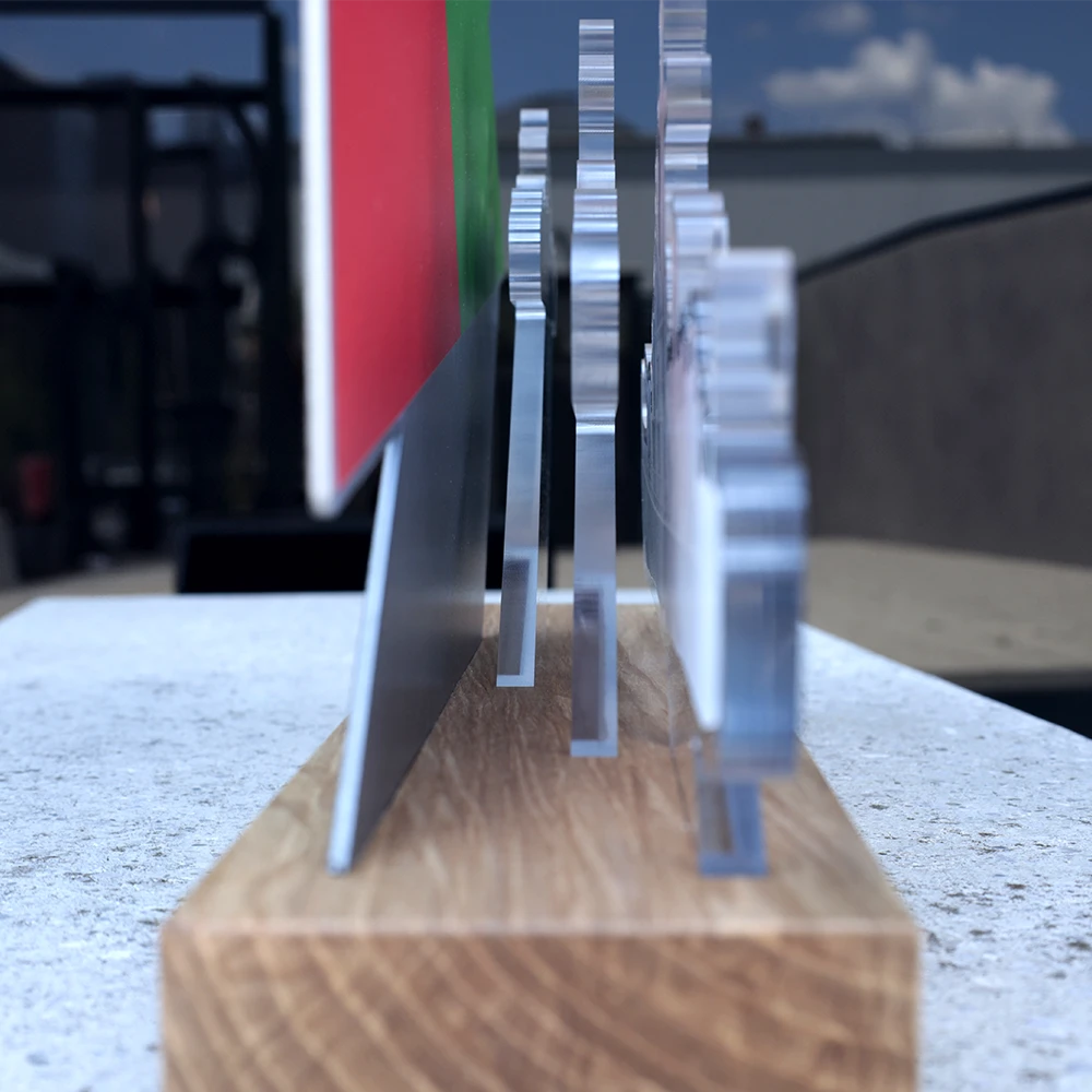 Les quatre éléments sont solidement fixés sur un socle en frêne, qui confère au design une élégance naturelle et une parfaite stabilité.