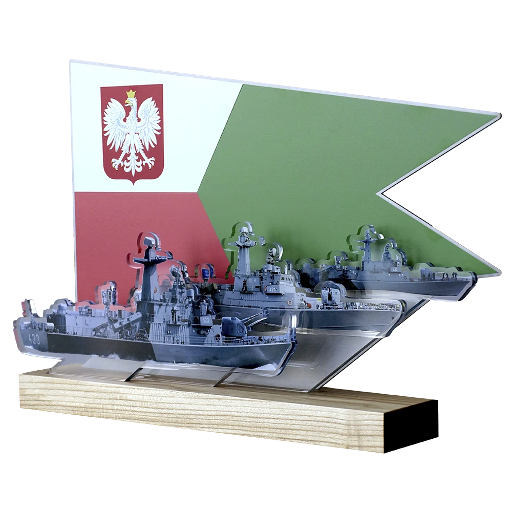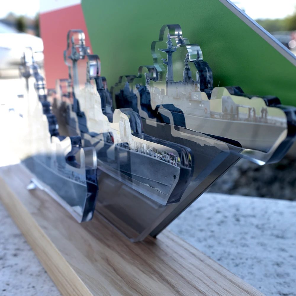 L’ensemble a été sublimé par une impression UV en couleurs, permettant de reproduire fidèlement les structures les plus délicates des navires et d’accentuer le caractère patriotique de la distinction — notamment grâce à l’emblème fédéral allemand placé dans l’angle supérieur gauche.