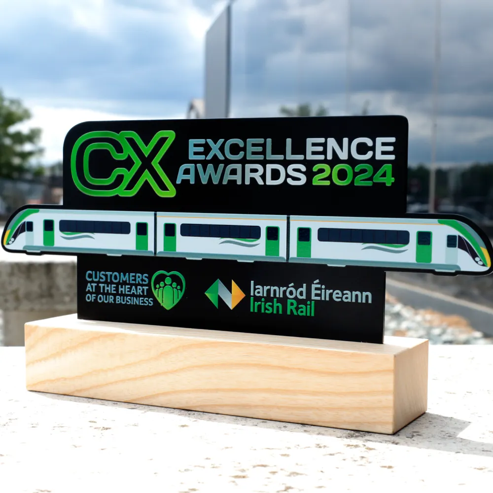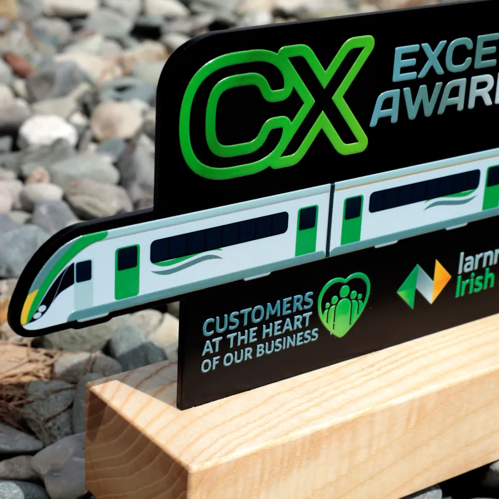 Cette élégante statuette marie harmonieusement tradition et design moderne, conçue pour honorer les partenaires clés et les clients. Réalisée en métal avec une finition satinée argentée, elle représente une locomotive stylisée évoquant les symboles des chemins de fer Iarnród Éireann. Les lignes dynamiques et les détails subtils lui confèrent un caractère moderne et affirmé.