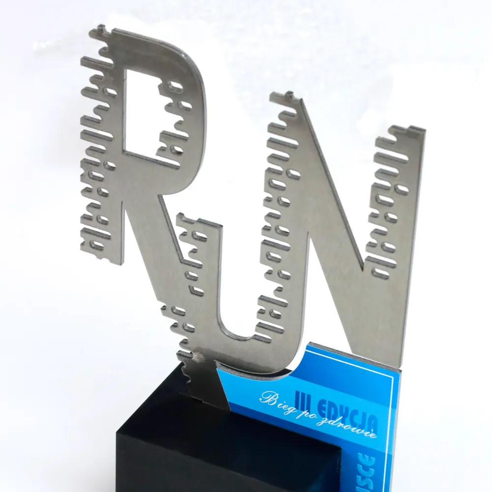 L’élément central du trophée est l’inscription métallique « RUN », découpée au laser dans du métal satiné. Les bords nets et précis apportent une touche contemporaine unique. La structure repose sur un socle en bois élégant, offrant stabilité et contraste avec l’aspect métallique.