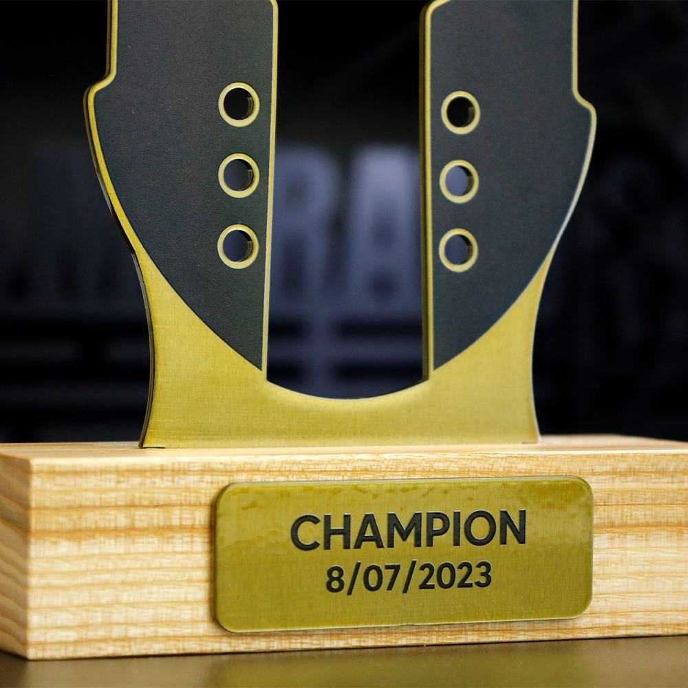 Les prix présentent une forme originale évoquant un casque. Des cavités à l’intérieur augmentent leur attractivité, tandis que l’impression en couleur, appliquée de manière renforcée, crée un effet 3D spectaculaire. Le trophée est fabriqué en métal épais et repose sur un socle en bois solide, complété par une plaque gravée.