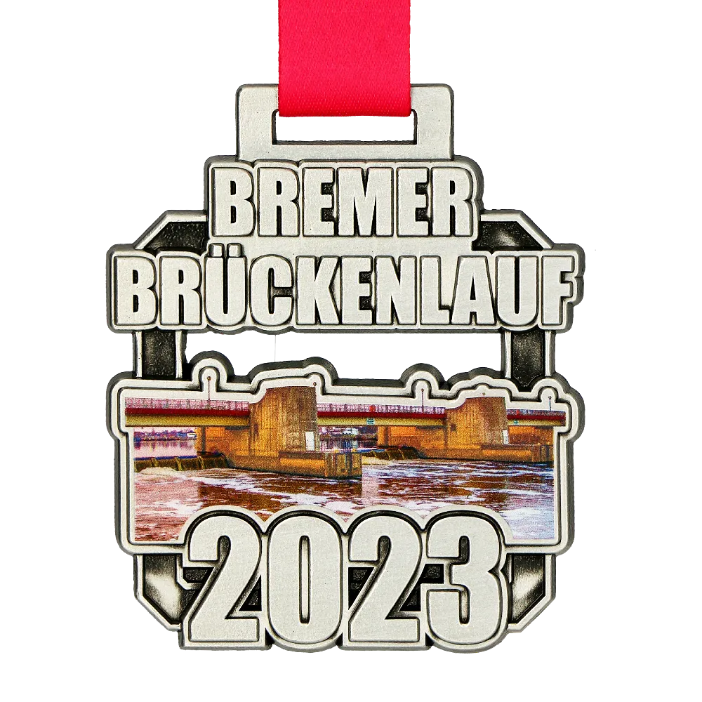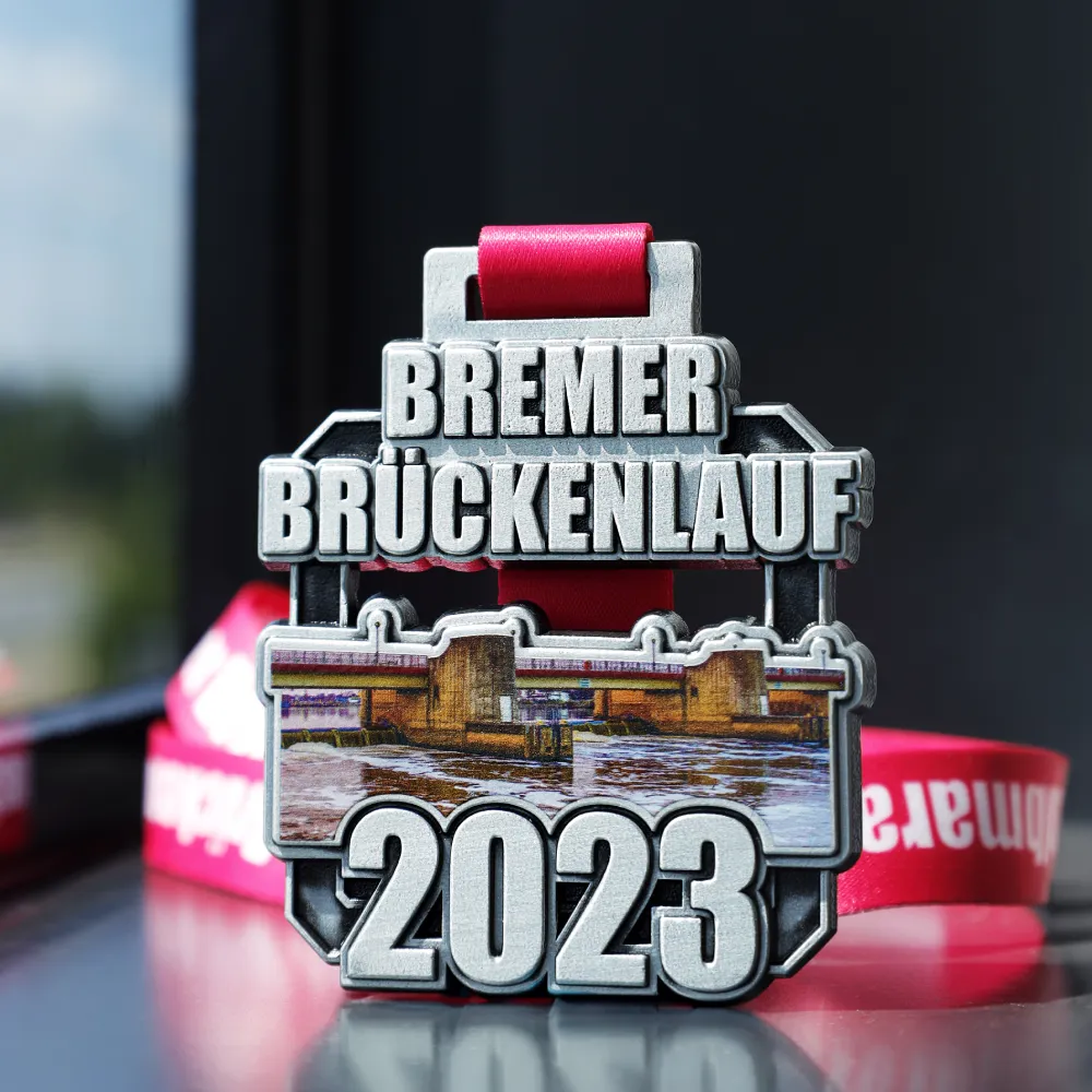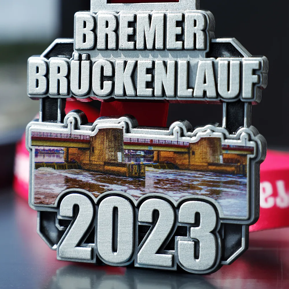 Cette médaille a été conçue pour le Bremer Brückenlauf 2023, un événement de course à pied au caractère urbain qui longe les ponts de la Weser. Au centre, une scène colorée représentant un pont souligne l’ancrage régional et l’atmosphère singulière du parcours. La gravure affirmée du nom de l’événement et de l’année apporte à la médaille une esthétique moderne et percutante.