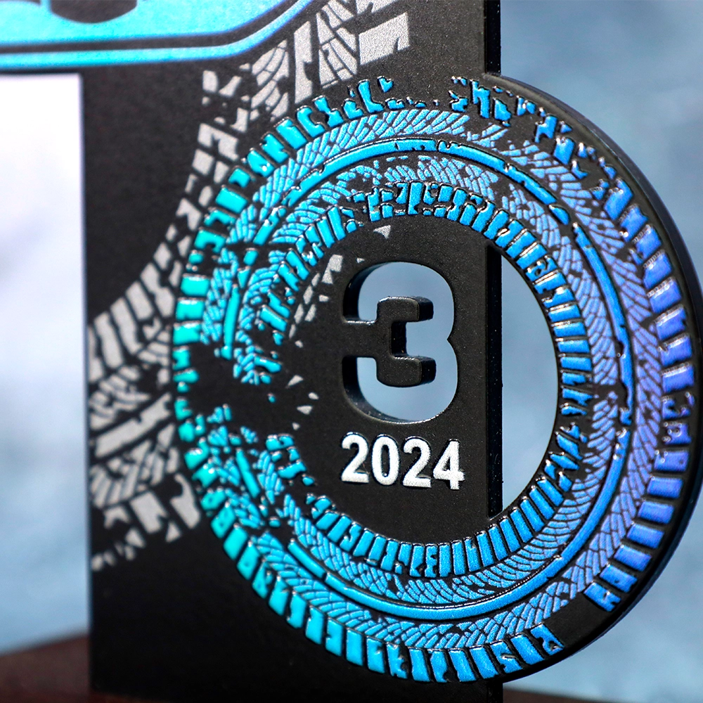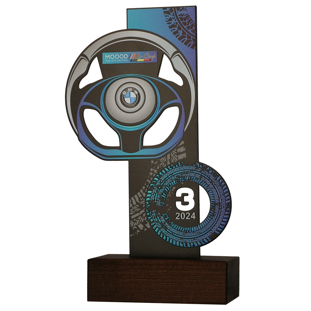 Trophée en métal sur un socle en bois, décoré d’une impression UV colorée. Sa conception se distingue par des détails fins et des ornements inspirés de l’univers du sport automobile. Il inclut également le nom de l’événement ainsi que l’indication du classement.