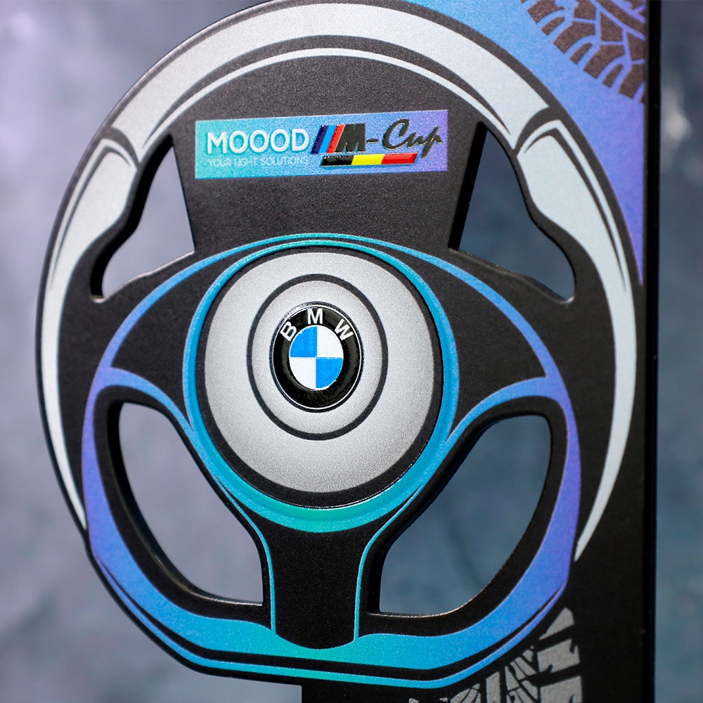 Les trophées sportives conçues pour le M-Cup sont des récompenses métalliques montées sur un socle en bois, avec un design riche en détails fins et éléments automobiles, comme des découpes et des gravures. Nous avons également ajouté une impression UV colorée, que l’on peut même ressentir au toucher à certains endroits. Un élément central de ces trophées est le lettrage qui met en valeur le nom de l’événement ainsi que la marque BMW. Dans l’ensemble, ces trophées reflètent parfaitement l’atmosphère de l’événement et capturent l’essence du MATS Performance M-Cup.