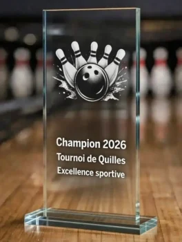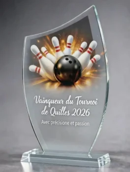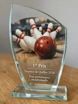 Les statuettes en verre personnalisées avec impression UV couleur représentent une solution premium idéale pour les clubs et les tournois de haut niveau. Sur la surface en verre, il est possible d’ajouter une piste de bowling, une boule, le logo du club ou du tournoi, ainsi qu’une dédicace spéciale pour le vainqueur.