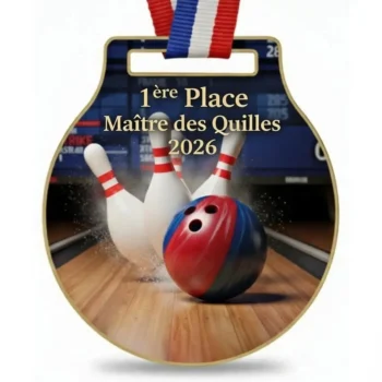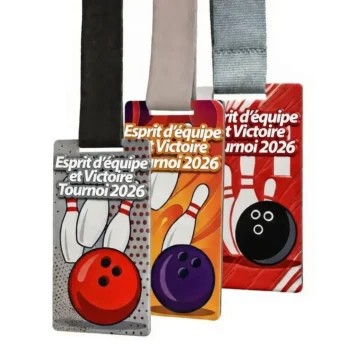 Les médailles métalliques personnalisées constituent une solution pratique et attractive, particulièrement adaptée aux tournois réunissant de nombreux participants. Elles peuvent inclure un motif de quilles et le logo de l’événement.