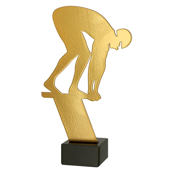 Trophée en métal Nageur est fabriqué en métal de haute qualité d’une épaisseur de 2 mm. La découpe laser permet de créer une silhouette dynamique du nageur dans une forme simple et moderne. La finition dorée apporte élégance et prestige, tandis que la base noire solide assure stabilité et raffinement.