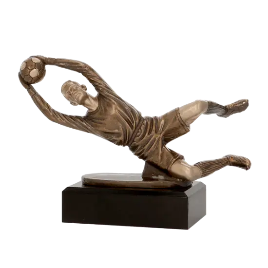 Ce trophée est réalisé en résine, ce qui lui confère légèreté et durabilité. La finition en bronze métallisé lui apporte une touche élégante et sportive, faisant de la figurine un élément décoratif idéal pour une étagère, un bureau ou une vitrine de récompenses. La reproduction précise du mouvement et de la tension musculaire transmet la passion, le dévouement et la détermination du joueur. Chaque détail – du maillot du gardien à l’expression concentrée de son visage – souligne sa préparation à défendre le but jusqu’aux dernières secondes du match. Ce mélange unique d’esthétique et de passion sportive fait de ce trophée non seulement un objet décoratif, mais aussi une source d’inspiration pour tout amateur de football.