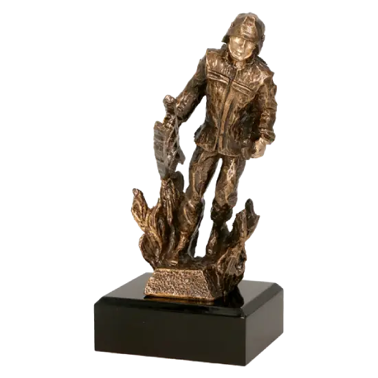 Ce trophée en résine représente un pompier debout au milieu des flammes, prêt à affronter un élément dangereux. La figurine incarne l’esprit de courage et de dévouement qui caractérise le quotidien des pompiers dans leur service.