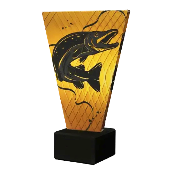 Le trophée Brochet est réalisé en verre de haute qualité, taillé en forme de trapèze élégant qui lui confère un style moderne et affirmé. L’élément central de la composition est une illustration d’un superbe brochet, dont la silhouette noire contraste harmonieusement avec un fond doré chaleureux.