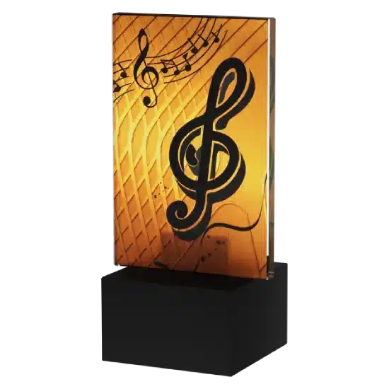 Ce trophée est réalisé en verre de haute qualité, sa forme rectangulaire lui conférant un caractère unique. Le devant du trophée est décoré d’un graphisme représentant une clé de sol – symbole universellement reconnu et associé à la musique, à sa beauté et à sa force d’expression. On y trouve également des notes sur une portée, renforçant le message musical.