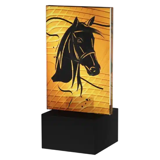 Les trophées en verre ont toujours été synonymes de classe et de qualité, et le modèle Équitation en est une parfaite illustration. Réalisé en verre épais et durable de forme rectangulaire, il présente le profil noir d’un cheval sur un fond doré et orangé.