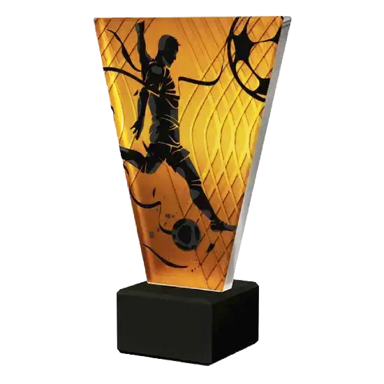 Ce trophée en verre attire le regard grâce à sa forme trapézoïdale. Le motif représente la silhouette d’un joueur en train de frapper le ballon, semblant effectuer le tir décisif vers le but.